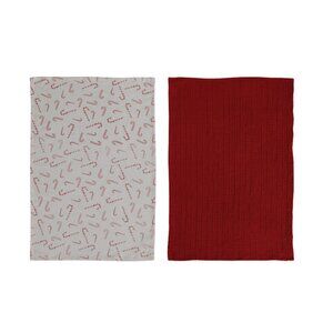 Set of 2 includes - one White and Red Candy Cane Pattern Towel and one Solid Red Waffle Weave Textured Towel. Arrives tied with a ribbon.