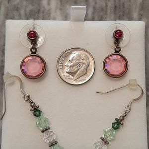 Set of 2 pairs of earrings: 1 pair pink rhinestones with post backs, the other pair green beads with wires.