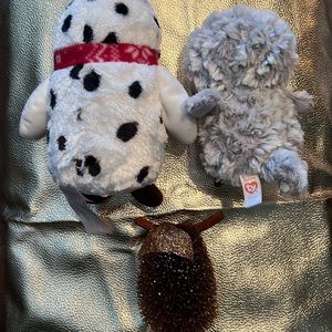 White with black dots 2019 Animal Adventures, grey 2017 Ty beanie Owlette, brown with beige face straw & glitter with wood feet