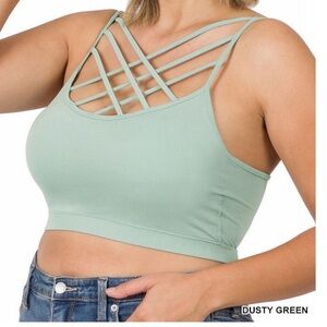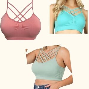 NWOT Set/3 Seamless Crisscross Bralette or Sports Bra in Rosy Pink, Sage Green & Teal Blue. The blue and pink are Yahada and One Size Fits Most. The Sage Green is Zenana and is L/XL. All have Crisscross straps in front. Adjustable straps on the Yahada. All have removable padding. All are in brand new condition. Makes a beautiful layering piece. The lattice design is eye-catching and unique. Smooth, comfortable fabric against the skin. These bras are extra stretch and form fitting. Offers just enough coverage that it can be worn solo as an exercise top, or under anything that requires a layering piece.