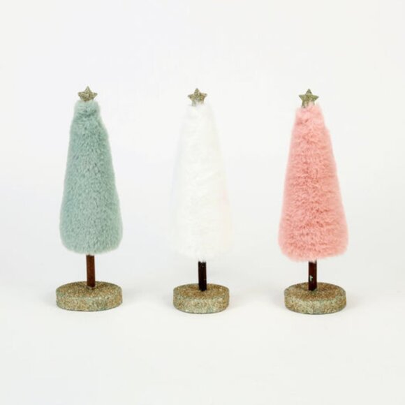 NEW Add a whimsical touch of glam to your holiday decor with this Set of 4 Fur Trees on Gold Glittered Bases. Each tree features a plush, velvety-soft fur finish in four colors - mint, blue, pink, and white. Topped with a sparkling gold glitter star and anchored on a coordinating glittered wood base, these trees bring festive shimmer and playful elegance to mantels, shelves, or table displays. *Props NOT included