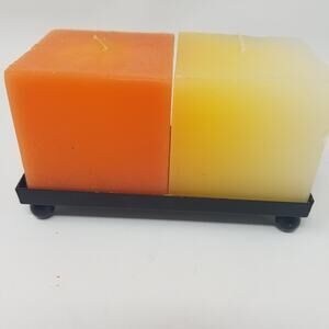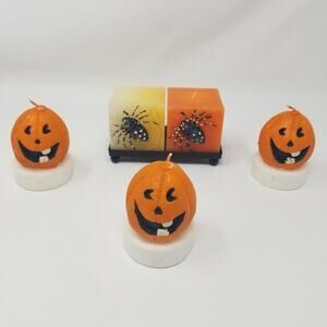 Set of 3 pumpkin candles and 2 spider candles on a metal pedestal. Spider pedestal and candles measure approx. 3 x 5 x 2.5 inches, small pumpkin candles measure approx. 2.5 x 2 x 5 x 3.25 inches.