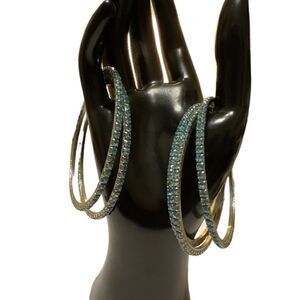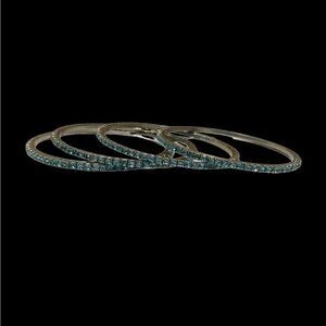 Gorgeous gold tone and turquoise rhinestone bangle bracelets that just shimmer in the light and the blue is just striking. Set of5 .No stones missing and they are just beautiful.