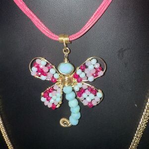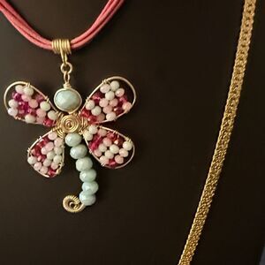 Set of 2 necklaces. Gold tone butterfly with multicolor beads & faceted stones on pink 4 stand cord with gold tone end caps and Shepard hook closure.