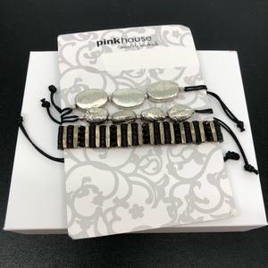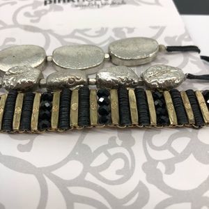 Set of 3 bracelets, featuring smooth textured silver tone beads and antiqued gold and black beads for a little metal mix stack. New on card, adjustable pull closure.