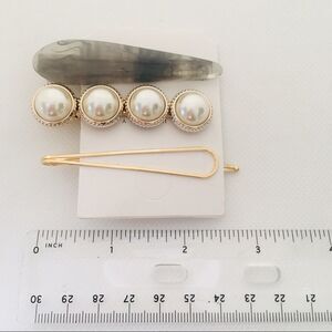 This set includes a light gray marble look clip, faux pearl clip & gold tone barrette. Use them together or separate for a variety of looks. Measurements in photos.