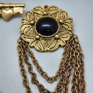 3) Gold tone heart brooch with a black center that is attached by two dangling chains to a second pendant that is shaped like a key with hearts under it.
