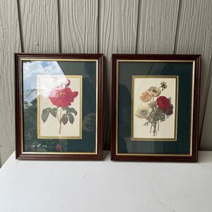 Elegant set of two framed botanical floral art prints featuring classic rose and anemone illustrations. Each print is professionally framed behind glass with a deep green mat, gold-tone trim, and dark wood-look frame. The style evokes a timeless vintage or traditional feel — perfect for a gallery wall, cottagecore décor, or a cozy reading nook.