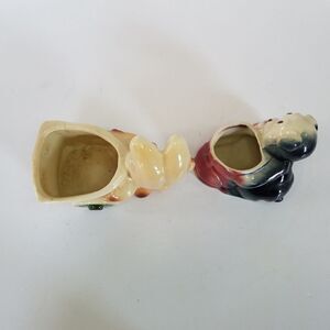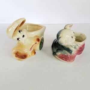 Add a little kitsch to your home décor with this pair of mid century sweet hand painted vintage planters. This pair features a Rabbit with Wheelbarrow Planter and A cute dog with a shoe. I am almost positive that these are Shawnee, but they do not have any markings on the bottom.