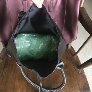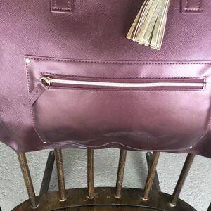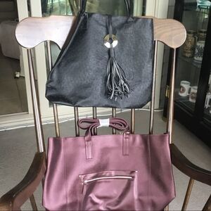 Two Tote set. Black very gently used and maroon is new. Both are vinyl, faux leather. Black has ostrich print, 13” length, 16” width, 2” depth with two shoulder straps. Maroon is pebble-finished, zipper close and has zippered front pouch, double handles. 12” length, 20” width, 7” depth. Manufacturer tagged at $48