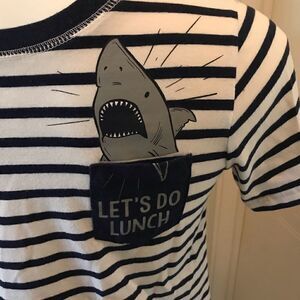 Shark: size L. Pit to pit: 17”. Sleeve: 7”. Length: 21”