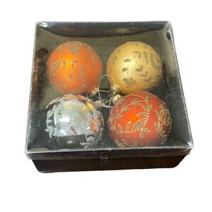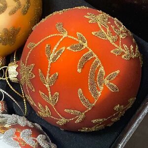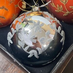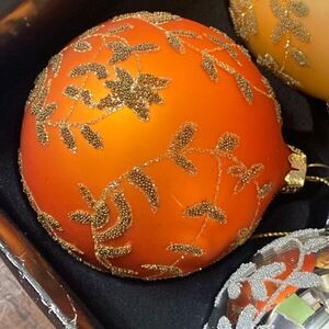 4 glass ornaments approx 3” diameter. Decorated with gold or silver glitter and mini beads.