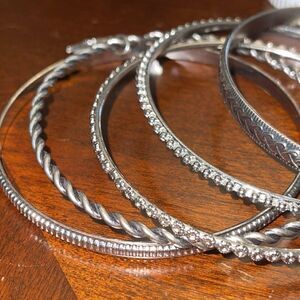 Set of 5 silver tone bracelets. Fit a 6.5 wrist. Minor scratches.