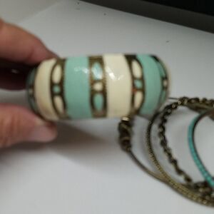 These 7 bangle bracelets go great together or wear them separately. Copper tone on all with teal and white accents. Pre-owned and in excellent condition. All offers welcome.