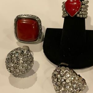 Set of 6 vintage costume rings in silver red and black. All have adjustable bands.
