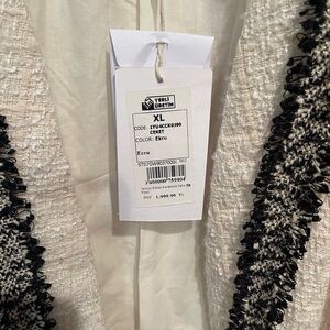 Turkish elegant cream textured blazer with black trim. Features two front pockets and a stylish open front design. **** it is missing a belt***still very cute without it.