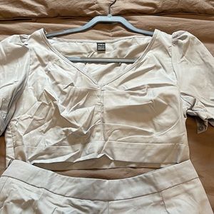 These are a set and will not be sold separately. They are a beautiful light blue color. My camera won’t show it’s true color. They are a little too small for me. I am athletic build and I just couldn’t get the top on. They read Large on the tags however. The top fits small.