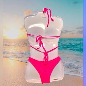 Pink Plain Contrast Binding High Cut Wire Bra Spaghetti Strap 2 Piece Set High Stretch