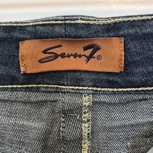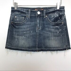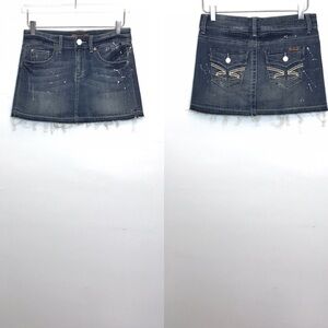 Cute Seven 7 denim miniskirt with bleached spots skirt has classic 5 pocket styling and released hem. Back pockets have button closures. All buttons are white. Skirt is in excellent pre-owned condition. Size 25.
