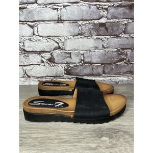 Selling Seven 7 For All Mankind Pearl Black Leather Vegan Slides Sandals Women sz 8M US/39EU