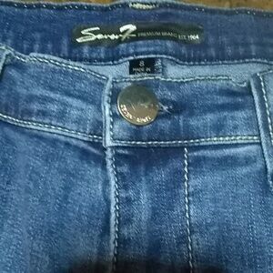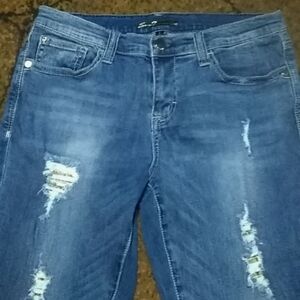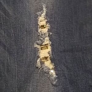 Seven 7 Jeans with Whiskering, Fading, and Distressing with Gold Sequin underneath (not holes). Purchased new with a dark spot below back pocket, see last photo. GUC. 99% Cotton and 1% Spandex. Smoke free home.