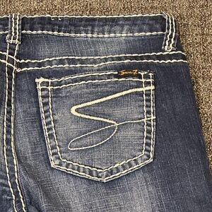 Elevate your denim game with these Seven7 women's jeans in a beautiful dark wash blue. The embroidered double stitching accents add a touch of bohemian vibe to the classic fit, making it perfect for any season. The jeans feature a zip and button closure, 5-pocket design, and a low rise of 6.5-8.5 inches with a waist size of 34 inches and an inseam of 28 inches.