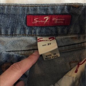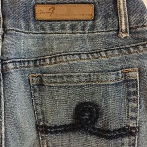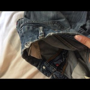 Stone wash faded and ripped jeans. Back pocket detail. I am 5'4" and I usually wear with flip flops. The jeans are long enough that they touch the ground when I wear with flip flops. They are pretty worn out and very comfortable. They are the old but good pair of jeans that you keep forever (except for in my case- my body completely changed post baby)