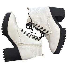 These Seven 7 Flatiron boots in size 10 feature a white vegan leather upper with a black 1 1/8” platform 3 1/2” block heel. They have a zip and lace-up closure, 5 1/2” ankle shaft style, round toe shape, and high heel height.