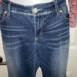 Elevate your denim collection with these stylish Seven7 flared leg jeans in a medium wash. The jeans feature a 5-pocket design with metallic stitching, rhinestone accents, and the Seven7 logo. The cotton blend fabric with stretch provides comfort and a flattering fit.