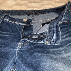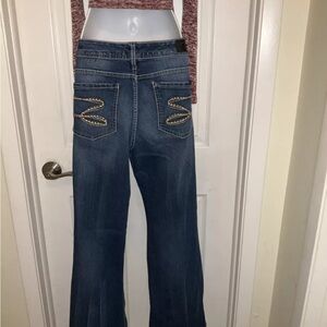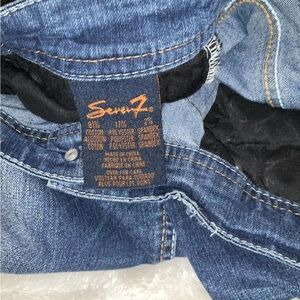 Preowned in good condition. No tears or stains. A great pair of flared jeans. There are 2 rhinestones missing on the button closure and there is wear on the back Seven 7 patch. Both are pictured. Please see pictures for measurement’s.