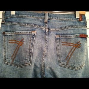 Pre-owned flare leg 7 for All Mankind Jeans in great condition! Sz.27, inseam 30.5, leg opening 10.2. These jeans are in great condition! There is some slight, VERY SLIGHT wear at the bottom of the jeans on the inseam. These pants have so much more life! Let me know if you have any questions!