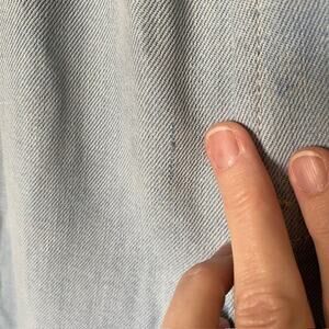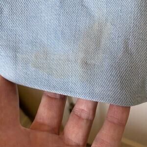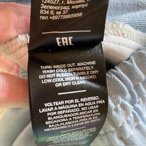 New With Tags. See 2nd & 3rd to last photos: there is a small run close to the waist and a shadow of a stain at the right front cuff.