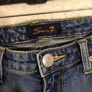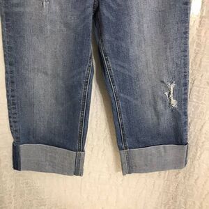 Blue denim cuffed distressed capri jeans. Front and back pockets. Embroidered back pockets design detail. Pre-owned in good condition. Please refer to pictures for best description and condition verification.
