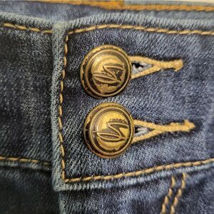 Sparkley blue "S" embellished pockets, dark wash, double button & zip fly, mid to low rise