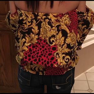 Scroll & animal prints stands out on the strapless cold shoulder top, finished with a dramatic ruffle detail.