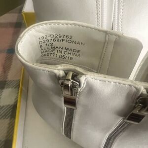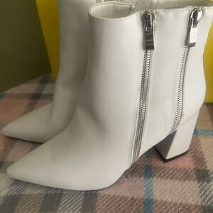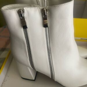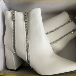 Elevate your footwear collection with these Seven Dials ankle booties, crafted in a pristine white hue. The dual silver-toned zippers add a touch of modern flair, while the structured silhouette and block heel offer both style and comfort. Perfect for a contemporary look, these booties seamlessly blend practicality with a fashion-forward design.