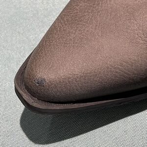 These booties are in good preowned condition. The heel measures approximately 2 1/2 inches. Please see pictures or details for the right toe scuff and the left outer heel picture a small Scuff