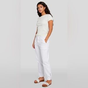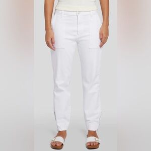• Darted Boyfriend Jogger Pant in White, slightly cropped, with belt loops, four-pocket styling and zippered elastic ankle cuffs