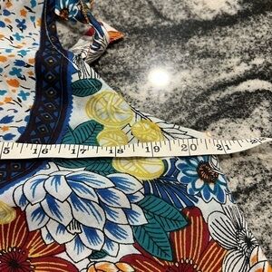 Multi pattern Summer dress Loose fitting Rayon Breezy 1/4 circle cut Shoulder ties Scoop neck Back and front mirrored EUC Measurements are included in the photos
