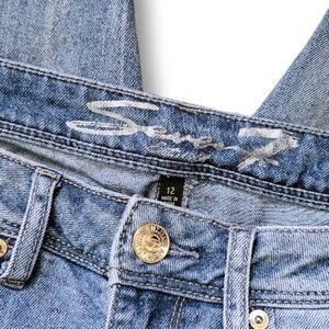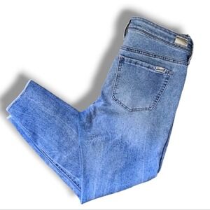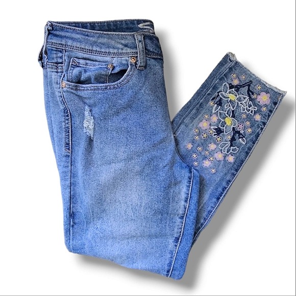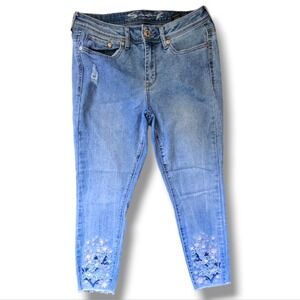 Seven Medium Wash High-Waisted Floral Embroidered Raw Hem Cropped Denim Skinny Jeans