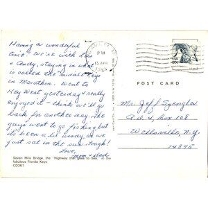 This vintage postcard features a vibrant sunset over the Seven Mile Bridge in Florida Keys, framed by silhouetted palm trees and water. Postmarked April 13, 1983, it has an authentic handwritten message on the reverse. Perfect for collectors or as a nostalgic keepsake.