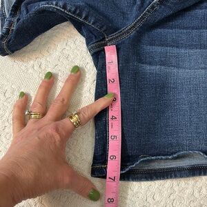 These Seven7 jean shorts in a medium-dark blue offer a timeless denim look with a clean-cut hem and subtle whiskering patterns. Crafted for comfort and style, they are perfect for casual outings and everyday wear.