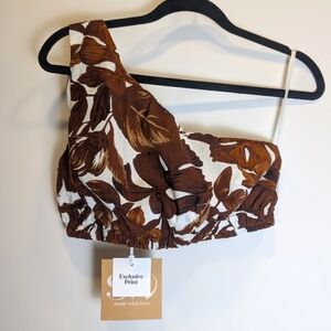 Has: Chocolate tropical floral design, One shoulder, Elastic under bust