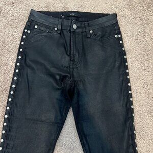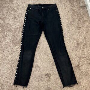 Raw hem. Silver studs down the sides. Black coated. Size 27. Perfect for fall and winter! Great condition!!!
