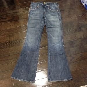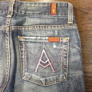 Pink A pocket back pocket stitching seven jeans. 7 1/2" front rise. 12 1/2" back rise. 31" inseam. 19" leg opening.