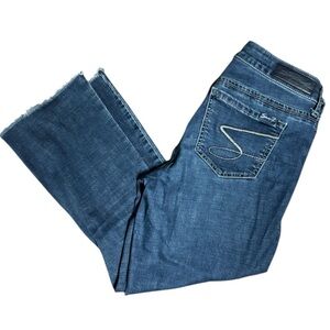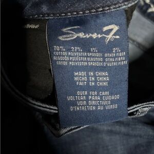 Seven7 Ankle Duster jeans in women’s size 8. These stylish jeans feature a medium blue wash, comfortable stretch fabric, and a flattering bootcut silhouette. The raw frayed hems add a laid-back, on-trend look. Great for everyday wear or casual outings!