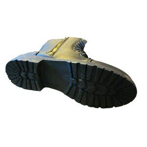 A women's size 10 chunky heeled, side zip, lace up shoe is perfect for going just about anywhere. Streetwear with antiqued brass hardware and faux leather with black laces.