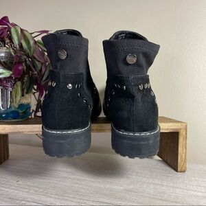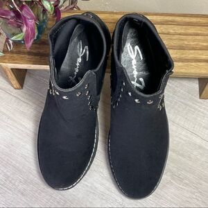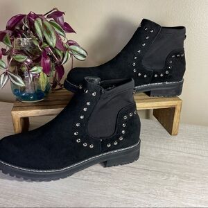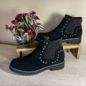 Woman Seven7 Black Ankle Booties Faux Suede with Silver Rivets and elastic ankle - easy to slip right on and go!