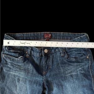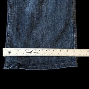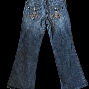 Pre-owned Seven7 women’s bootcut jeans in excellent condition. Medium wash blue denim with natural fading and whiskering for a flattering, worn-in look. Features orange embroidered back pockets, mid-rise fit, and a classic bootcut leg.