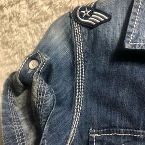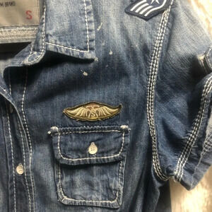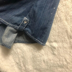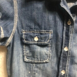 Natural splatter pattern on denim throughout shirt Sleeves can also be rolled up and buttoned